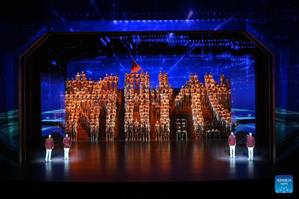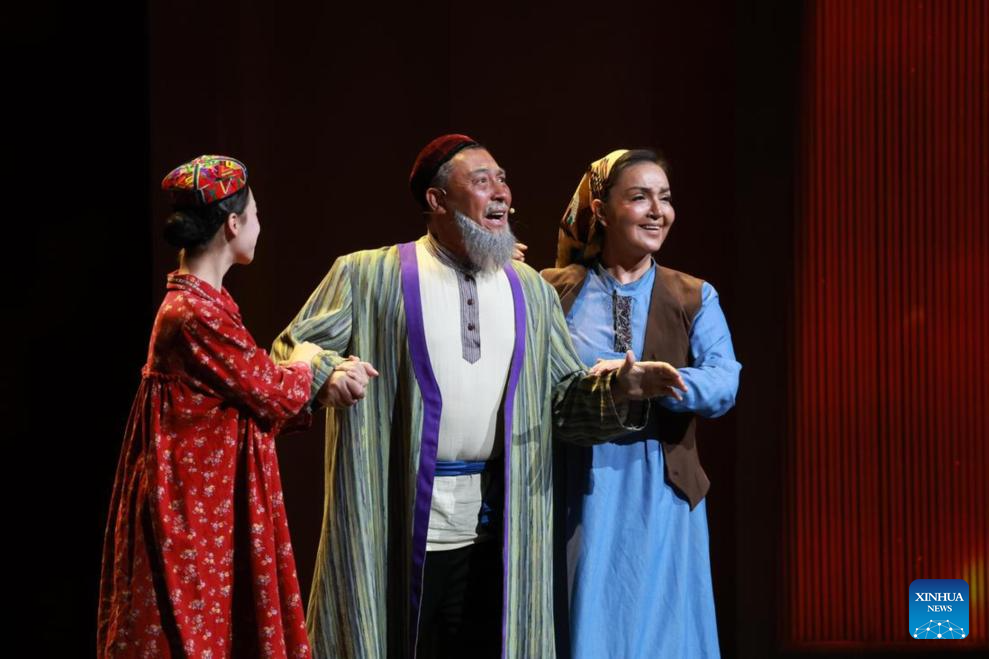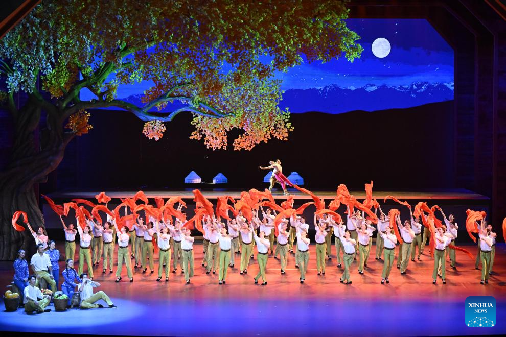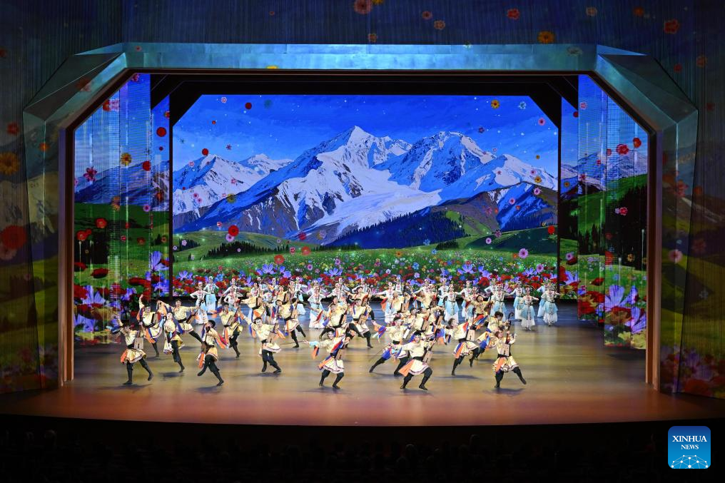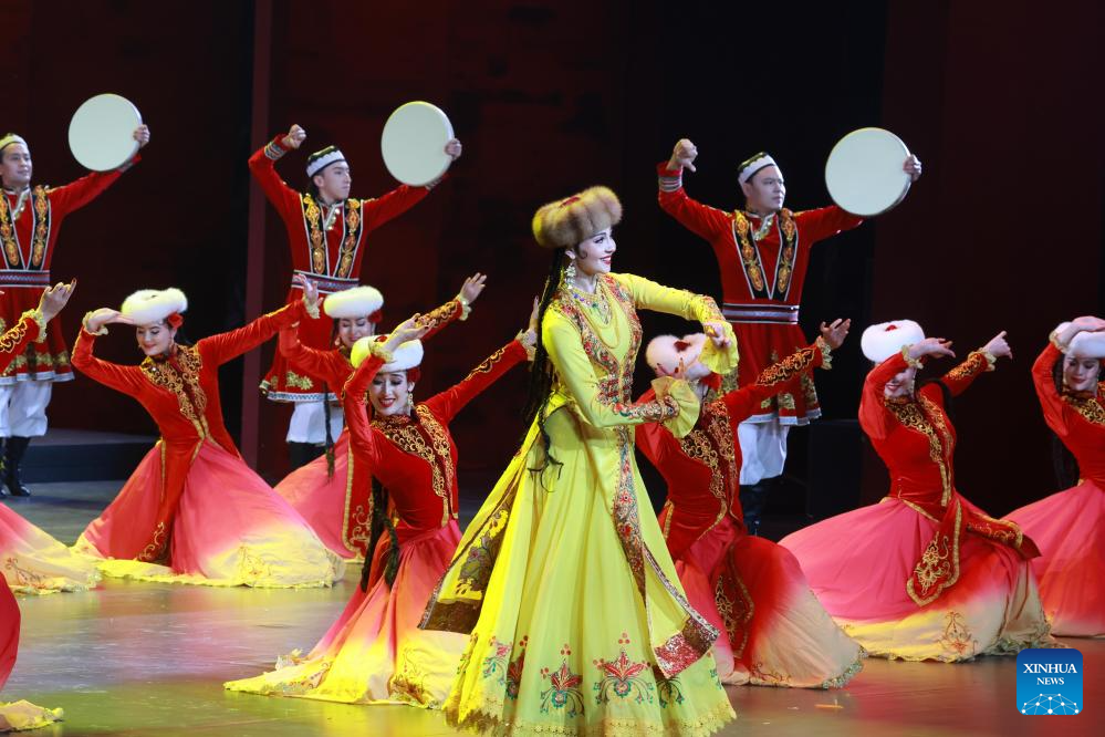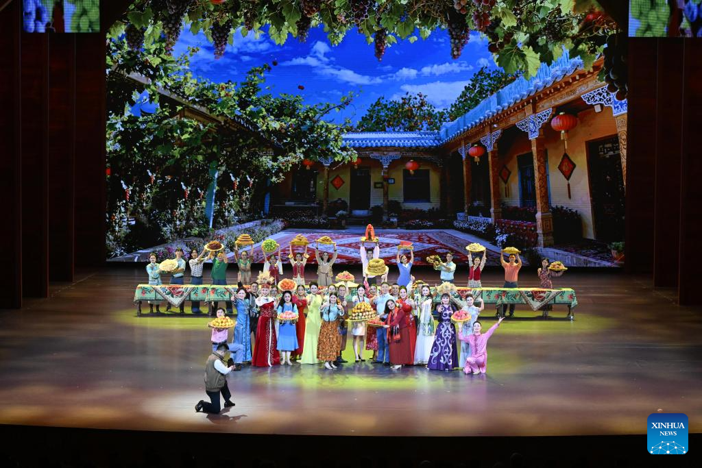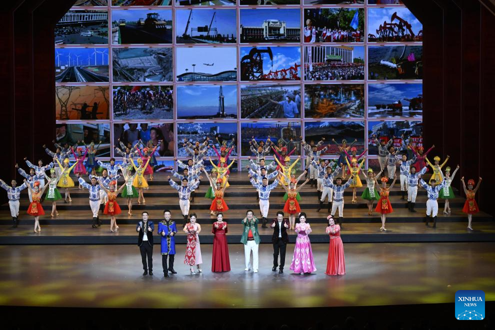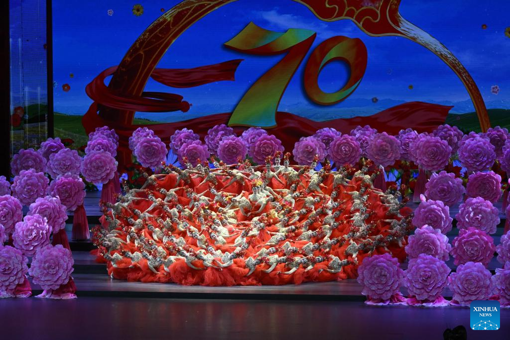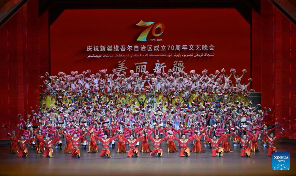 URUMQI, 24 septiembre, 2025 (Xinhua) -- Una gala titulada "Xinjiang Hermoso" es llevada a cabo para conmemorar el 70° aniversario de la fundación de la región autónoma uygur de Xinjiang, en Urumqi, la capital regional, el 24 de septiembre de 2025. (Xinhua/Ding Lin)