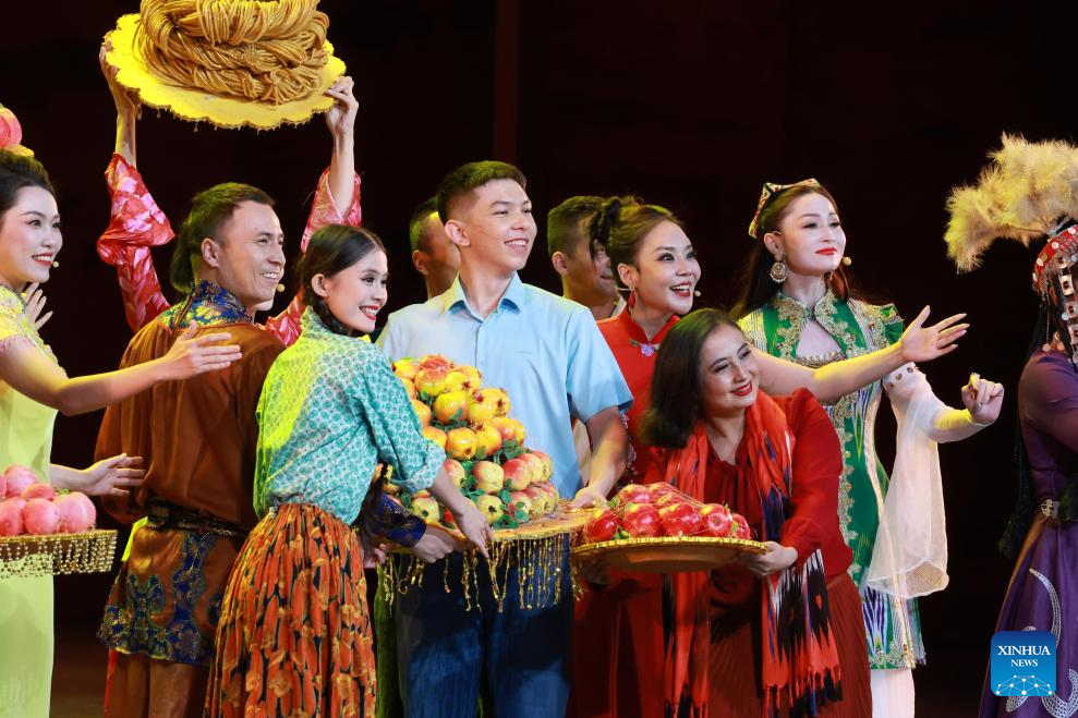 URUMQI, 24 septiembre, 2025 (Xinhua) -- Una gala titulada "Xinjiang Hermoso" es llevada a cabo para conmemorar el 70° aniversario de la fundación de la región autónoma uygur de Xinjiang, en Urumqi, la capital regional, el 24 de septiembre de 2025. (Xinhua/Shen Hong)