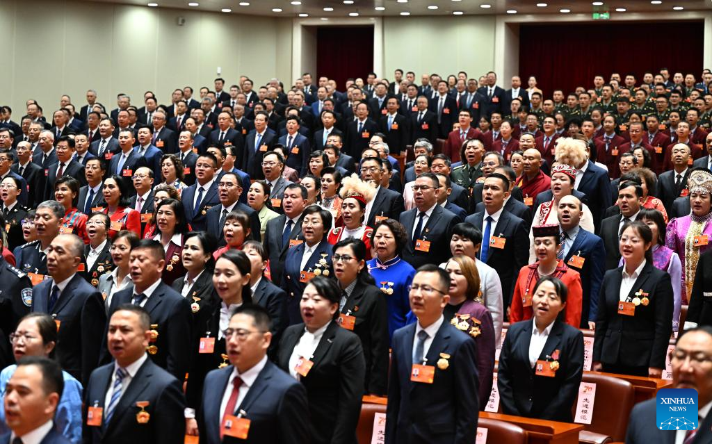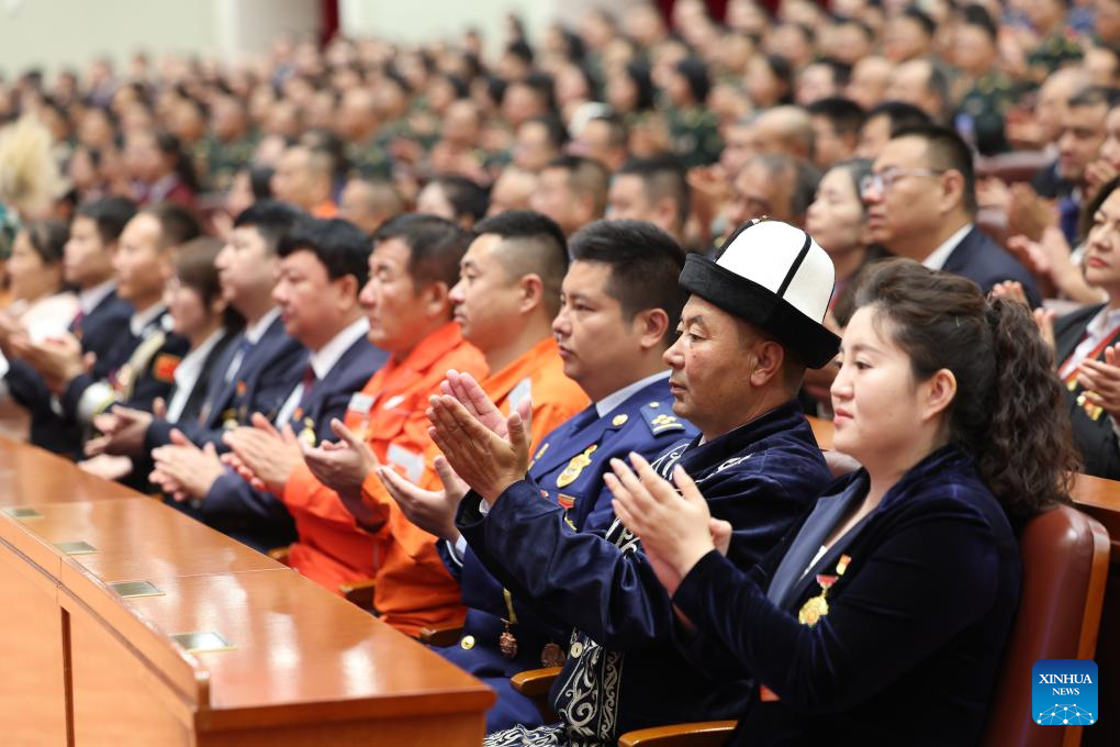 URUMQI, 25 septiembre, 2025 (Xinhua) -- Una gran reunión con motivo del 70º aniversario de la fundación de la región autónoma uygur de Xinjiang se realiza en Urumqi, la capital regional, en el noroeste de China, el 25 de septiembre de 2025. (Xinhua/Shen Hong)