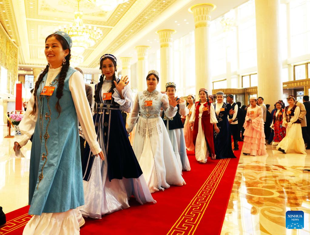 URUMQI, 25 septiembre, 2025 (Xinhua) -- Participantes ingresan al Salón del Pueblo de Xinjiang previo a una gran reunión con motivo del 70º aniversario de la fundación de la región autónoma uygur de Xinjiang, en Urumqi, la capital regional, en el noroeste de China, el 25 de septiembre de 2025. (Xinhua/Chen Bin)