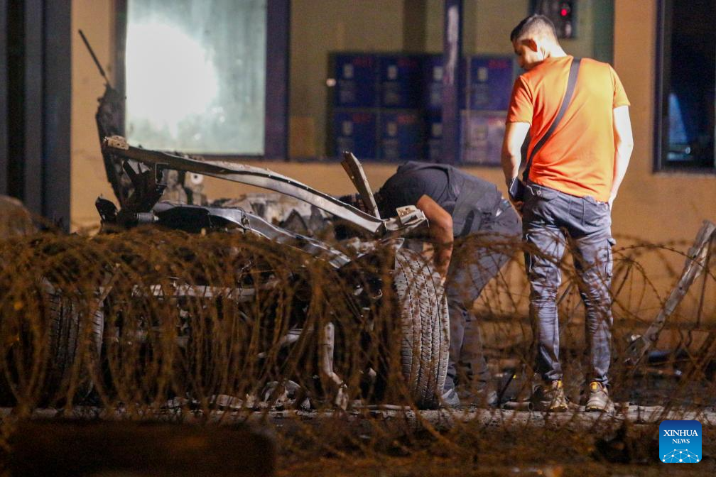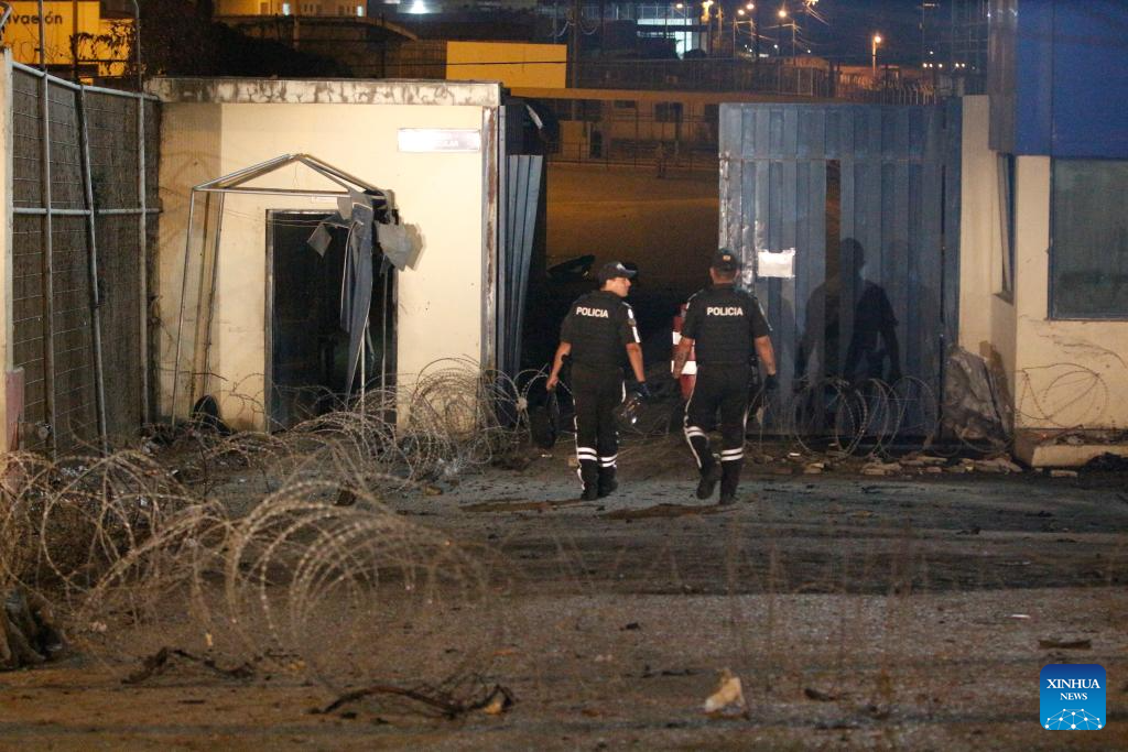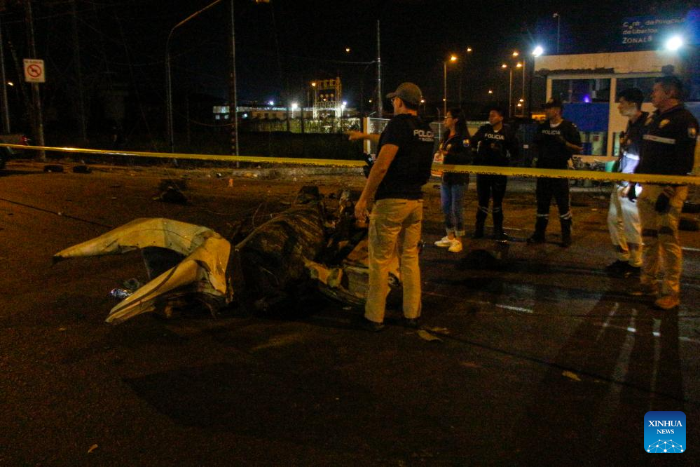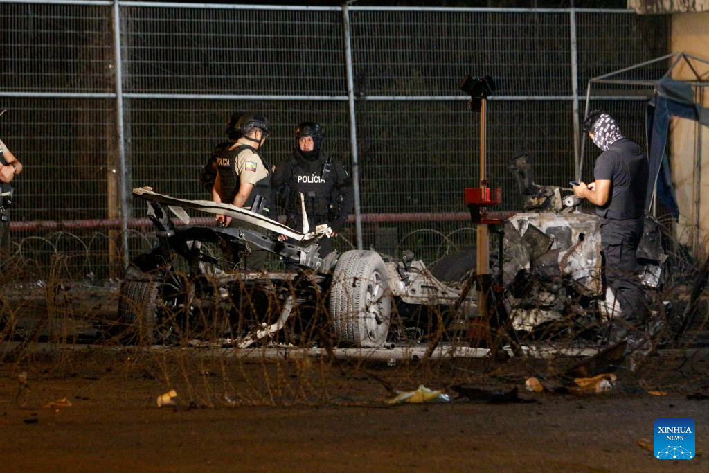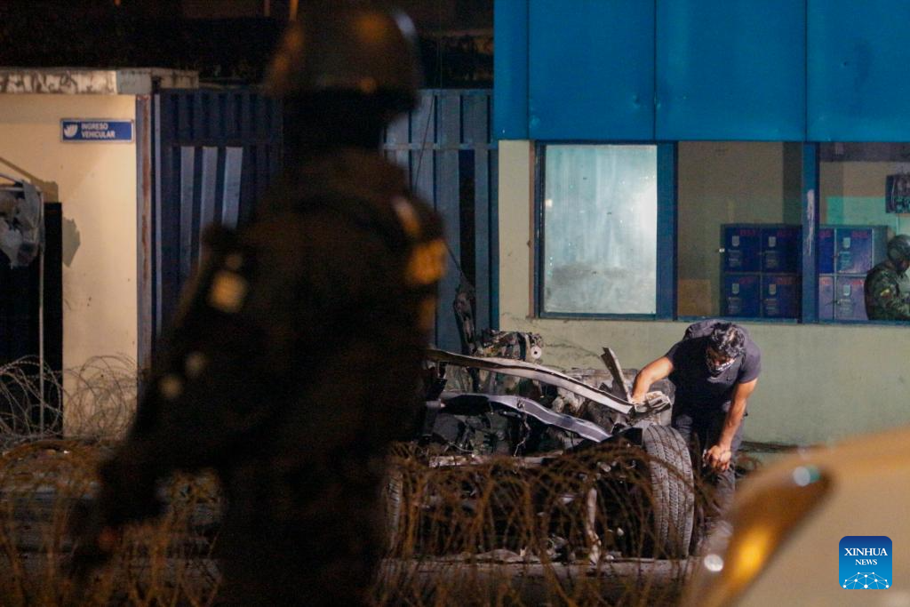 GUAYAQUIL, 27 septiembre, 2025 (Xinhua) -- Imagen del 26 de septiembre de 2025 de policías revisando en el sitio donde explotó un coche bomba frente a la Cárcel Regional de Guayaquil, en la ciudad de Guayaquil, Ecuador. La explosión de un coche bomba ocurrido la noche del viernes frente a la puerta principal de la Cárcel Regional de Guayaquil, la segunda más grande de Ecuador, causó daños en la fachada del penal, informó el sábado la prensa local que citó fuentes militares. (Xinhua/Str)
