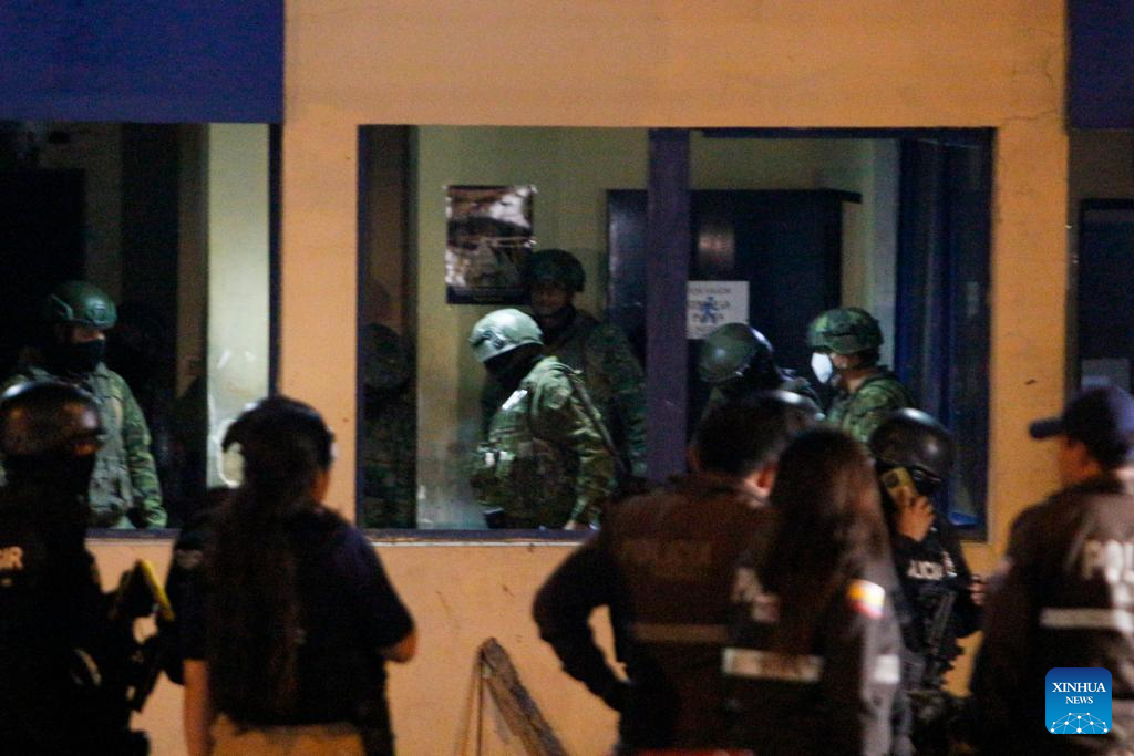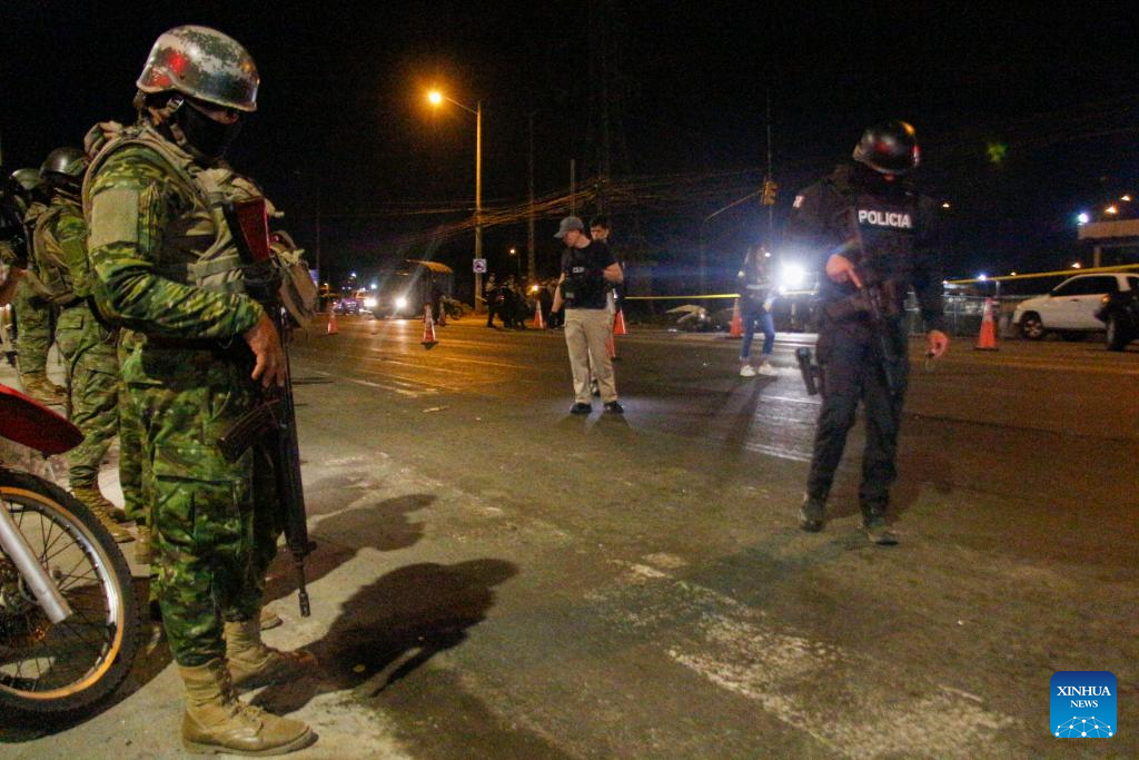 GUAYAQUIL, 27 septiembre, 2025 (Xinhua) -- Imagen del 26 de septiembre de 2025 de militares y policías vistos en el sitio donde explotó un coche bomba frente a la Cárcel Regional de Guayaquil, en la ciudad de Guayaquil, Ecuador. La explosión de un coche bomba ocurrido la noche del viernes frente a la puerta principal de la Cárcel Regional de Guayaquil, la segunda más grande de Ecuador, causó daños en la fachada del penal, informó el sábado la prensa local que citó fuentes militares. (Xinhua/Str)