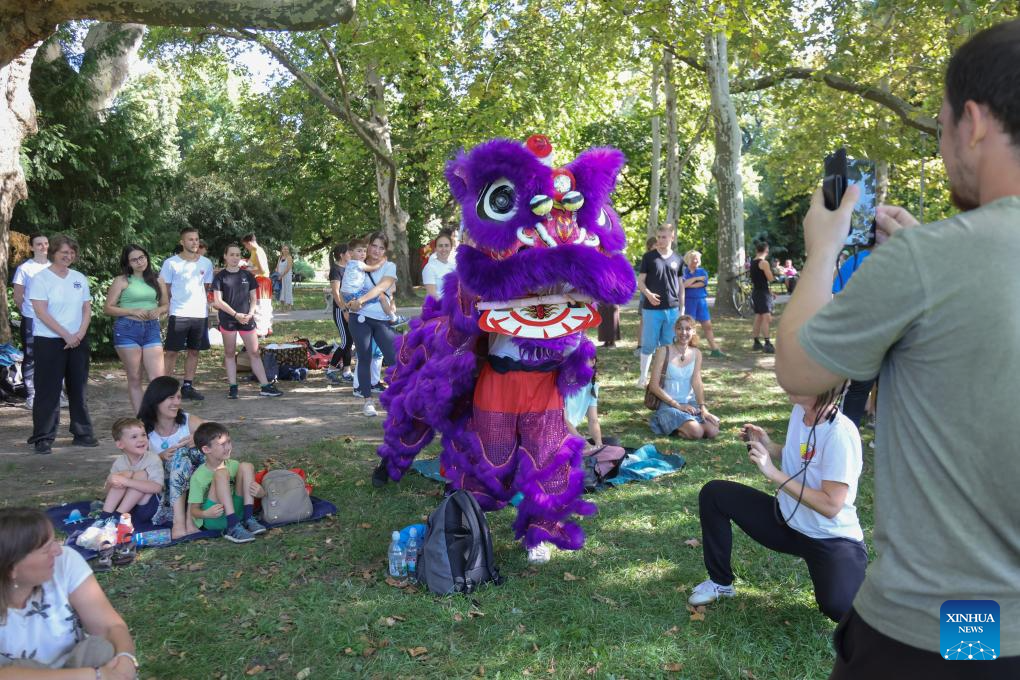 BUDAPEST, 26 septiembre, 2025 (Xinhua) -- Imagen del 21 de septiembre de 2025 de un bailarín de la danza del león presentándose en el Día de Chan Wu en un parque público, en Budapest, Hungría. El anual Día de Chan Wu en Hungría se ha convertido en una ocasión importante para que las familias y amigos húngaros celebren la cultura china. (Xinhua/Attila Volgyi)