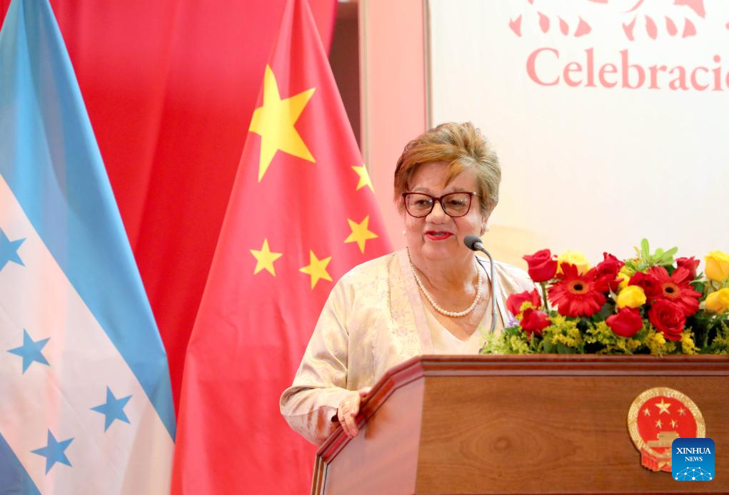 Imagen del 25 de septiembre de 2025 de la designada presidencial de Honduras, Doris Alejandrina Gutiérrez, hablando durante una recepción con motivo del 76° aniversario de la fundación de la República Popular China, en Tegucigalpa, Honduras. La Embajada de China en Honduras celebró el jueves una recepción con motivo del 76° aniversario de la fundación de la República Popular China, destacando el respeto mutuo, la cooperación y los valores universales que fortalecen la relación bilateral entre ambas naciones. (Xinhua/Str)