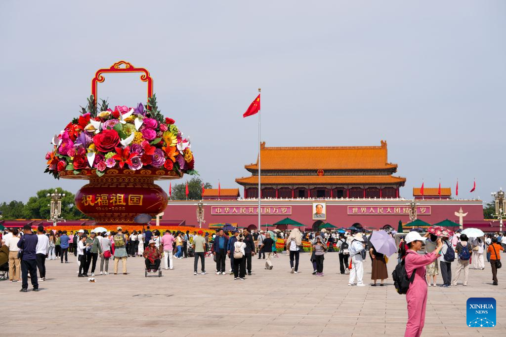 BEIJING, 26 septiembre, 2025 (Xinhua) -- Imagen del 25 de septiembre de 2025 de turistas observando una instalación de "cesta de flores" en la Plaza Tian'anmen, en Beijing, capital de China. La instalación de 18 metros de altura y con forma de cesta de flores se ha colocado en la Plaza Tian'anmen como decoración para las próximas vacaciones del Día Nacional. (Xinhua/Ju Huanzong)