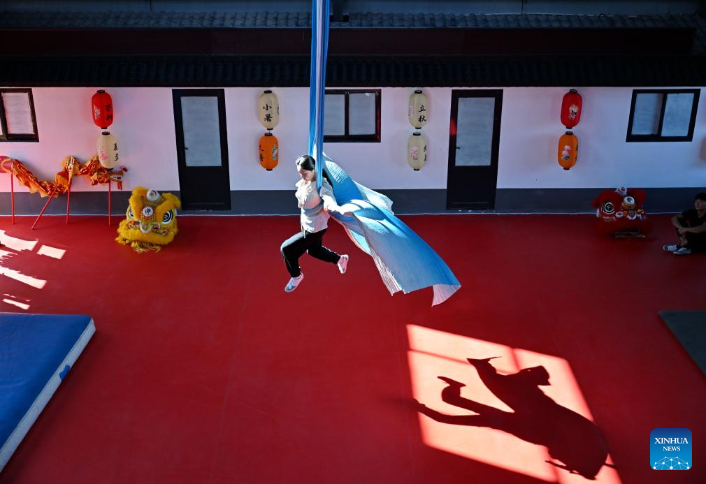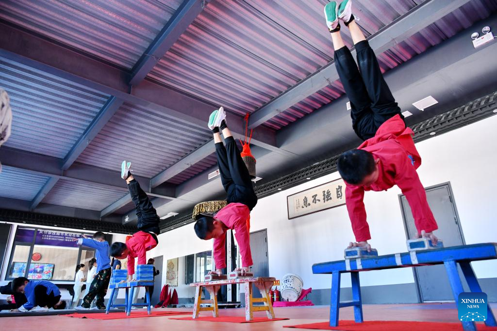 SHIJIAZHUANG, 26 septiembre, 2025 (Xinhua) -- Imagen del 25 de septiembre de 2025 de estudiantes practicando habilidades acrobáticas en el patio acrobático de Zhang Shuo, en el poblado de Sangyuan, en el distrito de Wuqiao, en la provincia de Hebei, en el norte de China. Wuqiao, conocida como la cuna del arte acrobático chino, cuenta con 14 "patios acrobáticos" diferentes que sirven como un conjunto de bases para la formación de artistas, el diseño de nuevas obras y la investigación del arte popular. (Xinhua/Mu Yu)
