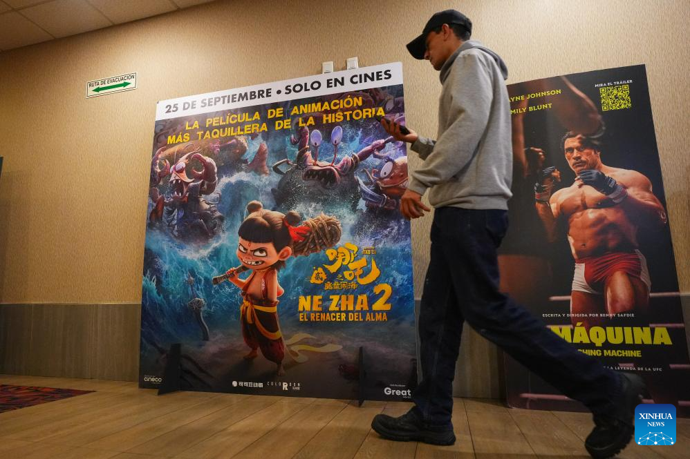 BOGOTA, 27 septiembre, 2025 (Xinhua) -- Imagen del 26 de septiembre de 2025 de un hombre caminando frente a un cartel de la película de animación china "Ne Zha 2" en un cine, en Bogotá, capital de Colombia. Con su arribo a Latinoamérica el 25 de septiembre, los colombianos disfrutan de la exhibición de "Ne Zha 2", la película animada más taquillera de la historia y que ha recaudado de más de 2.000 millones de dólares desde su estreno en China el 29 de enero de 2025. (Xinhua/Andrés Moreno)