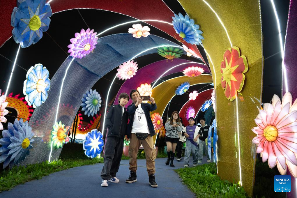 BUENOS AIRES, 27 septiembre, 2025 (Xinhua) -- Imagen del 26 de septiembre de 2025 de personas observando una escultura iluminada durante la feria de luces tradicionales chinas Tianfu Festival, en el predio ferial Tecnópolis, en la localidad de Villa Martelli, en la periferia noroeste de Buenos Aires, Argentina. El reconocido festival de linternas chinas Tianfu, una atractiva experiencia multisensorial basada en la cultura de China, fue inaugurado en Argentina, llenando de luz y color las noches primaverales en el país sudamericano. (Xinhua/Martín Zabala)