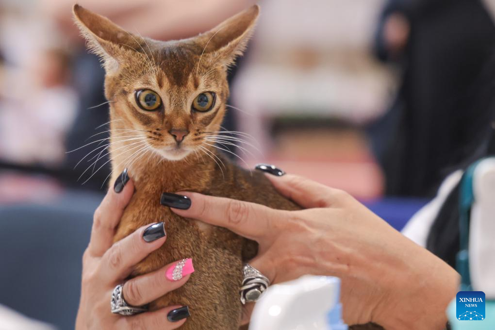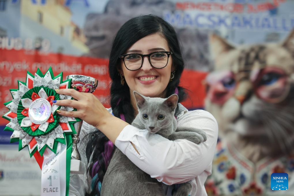 BUDAPEST, 29 septiembre, 2025 (Xinhua) -- Imagen del 28 de septiembre de 2025 de una propietaria mostrando su premio durante la exposición felina de la Federación Mundial Felina, en Budapest, Hungría. (Xinhua/Attila Volgyi)