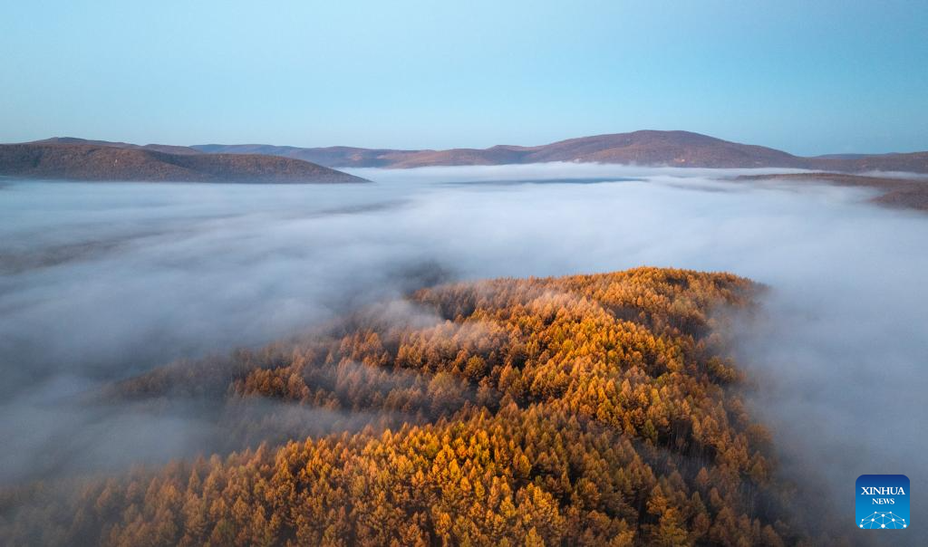 LIGA HINGGAN, 29 septiembre, 2025 (Xinhua) -- Imagen tomada con un dron el 29 de septiembre de 2025 del paisaje de otoño del Parque Forestal Nacional Arxan, en Arxan, en la liga Hinggan, en la región autónoma de Mongolia Interior, en el norte de China. (Xinhua/Bei He)