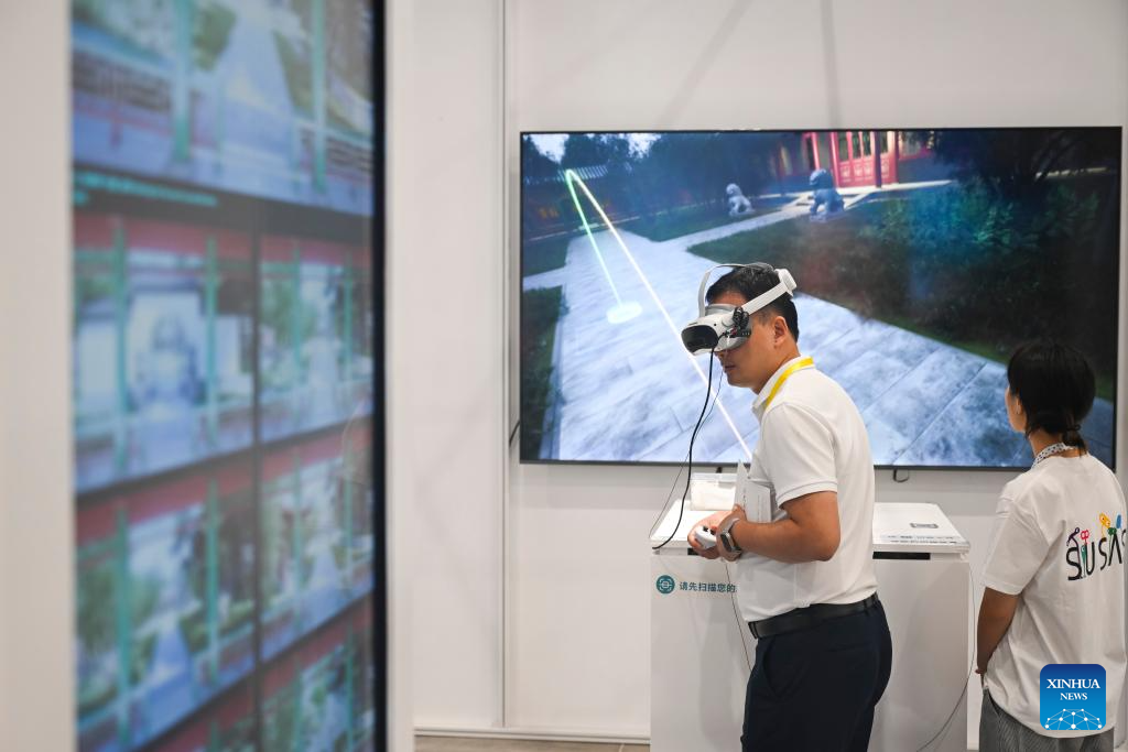 SHANGHAI, 30 septiembre, 2025 (Xinhua) -- Un visitante participa en una experiencia de realidad virtual durante una exposición de la Temporada de Arte del Espacio Urbano de Shanghai 2025, en Shanghai, en el este de China, el 30 de septiembre de 2025. Una exposición de diseño de ciencia y tecnología, una muestra de arte, un espectáculo de drones y un espectáculo de luces están programadas para llevarse a cabo durante el evento. (Xinhua/Chen Haoming)