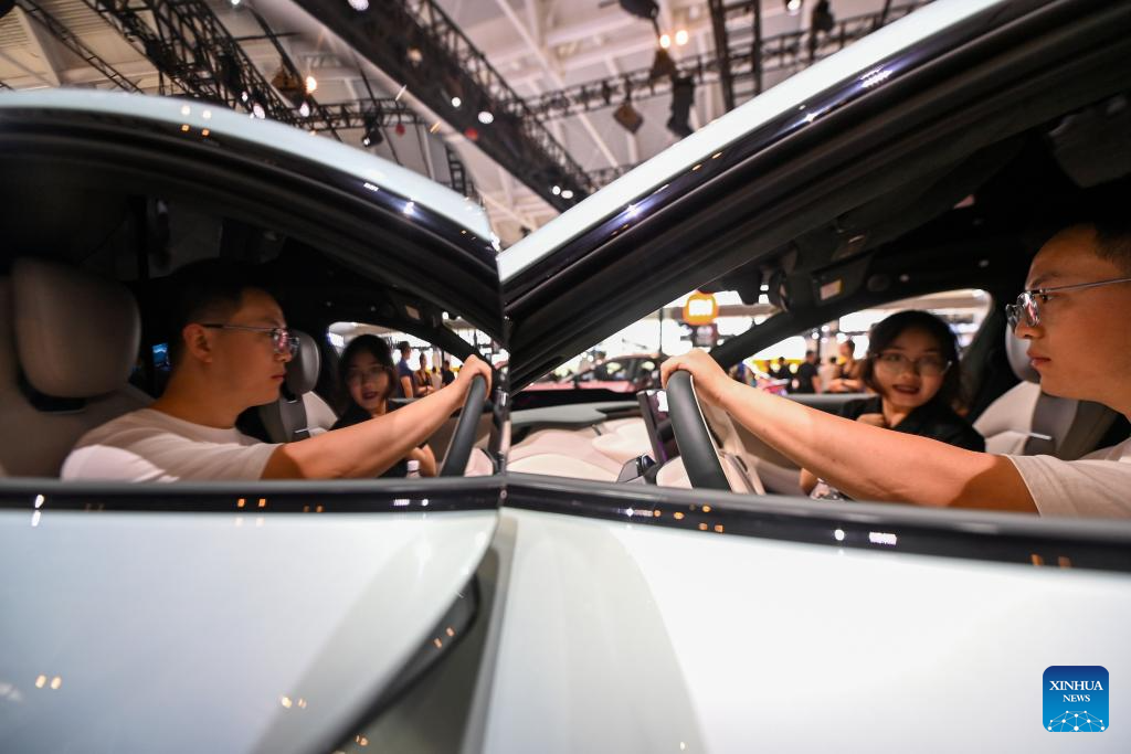 TIANJIN, 30 septiembre, 2025 (Xinhua) -- Un visitante pregunta por un automóvil equipado con funciones de conducción inteligente durante el Salón del Automóvil de China (Tianjin) 2025, en Tianjin, en el norte de China, el 30 de septiembre de 2025. Con una superficie total de exposición de 200.000 metros cuadrados, el salón del automóvil muestra 920 vehículos, incluidos 480 vehículos de nueva energía. (Xinhua/Sun Fanyue)