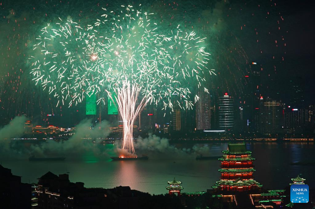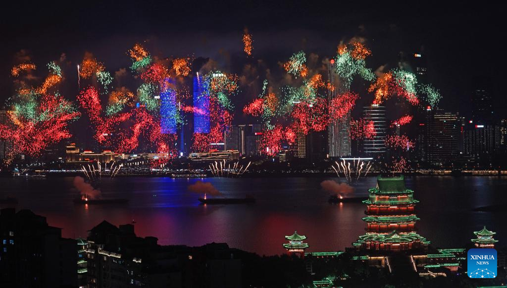 NANCHANG, 1 octubre, 2025 (Xinhua) -- Fuegos artificiales para celebrar el 76º aniversario de la fundación de la República Popular China iluminan el cielo sobre el río Ganjiang, en Nanchang, en la provincia de Jiangxi, en el este de China, el 1 de octubre de 2025. (Xinhua/Wan Xiang)