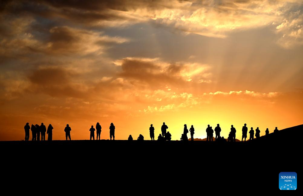 BEIJING, 2 octubre, 2025 (Xinhua) -- Turistas disfrutan el amanecer sobre el desierto en el área escénica de la Montaña Mingsha y el Manantial de la Luna Creciente, en la ciudad de Dunhuang, en la provincia de Gansu, en el noroeste de China, el 2 de octubre de 2025. Con el Festival de Medio Otoño de China coincidiendo este año con el Día Nacional, las personas pasan su tiempo libre de diferentes maneras durante las vacaciones de ocho días de duración. (Xinhua/Zhang Xiaoliang)