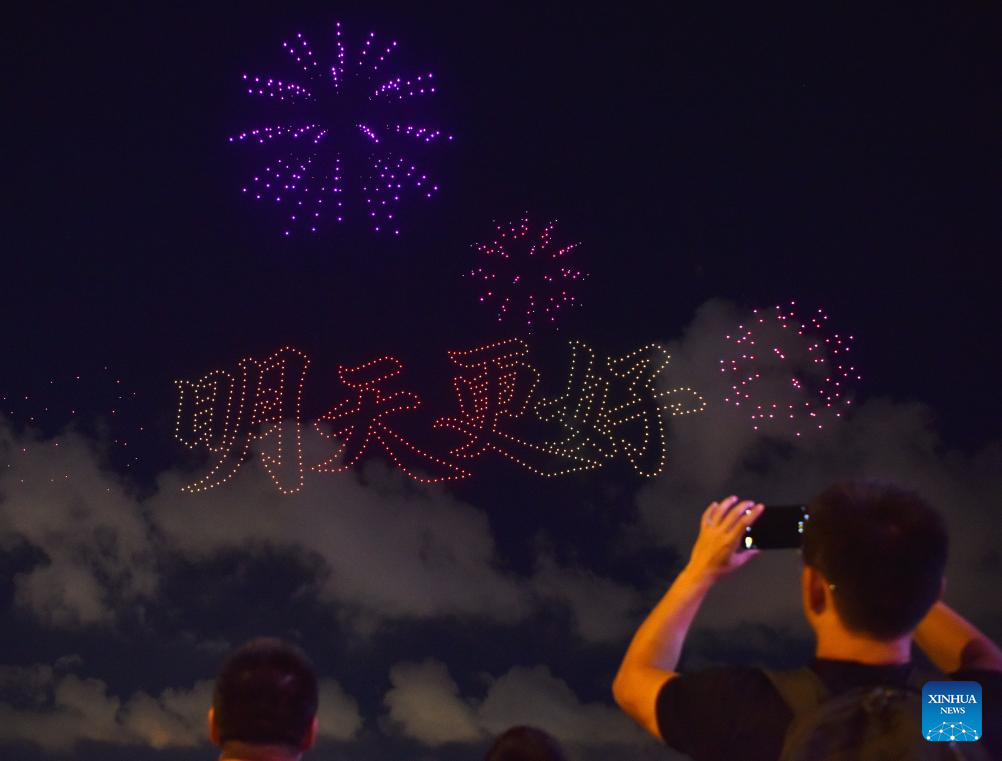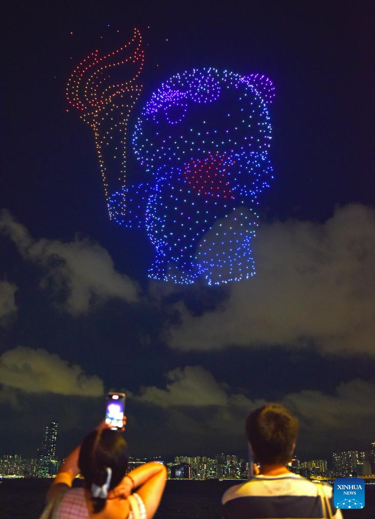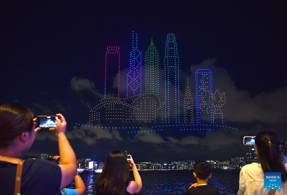 HONG KONG, 2 octubre, 2025 (Xinhua) -- Un espectáculo de luces con drones es presentado en celebración del 76º aniversario de la fundación de la República Popular China, en Hong Kong, en el sur de China, el 2 de octubre de 2025. (Xinhua/Chen Duo)