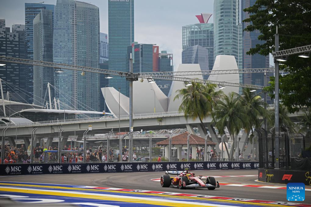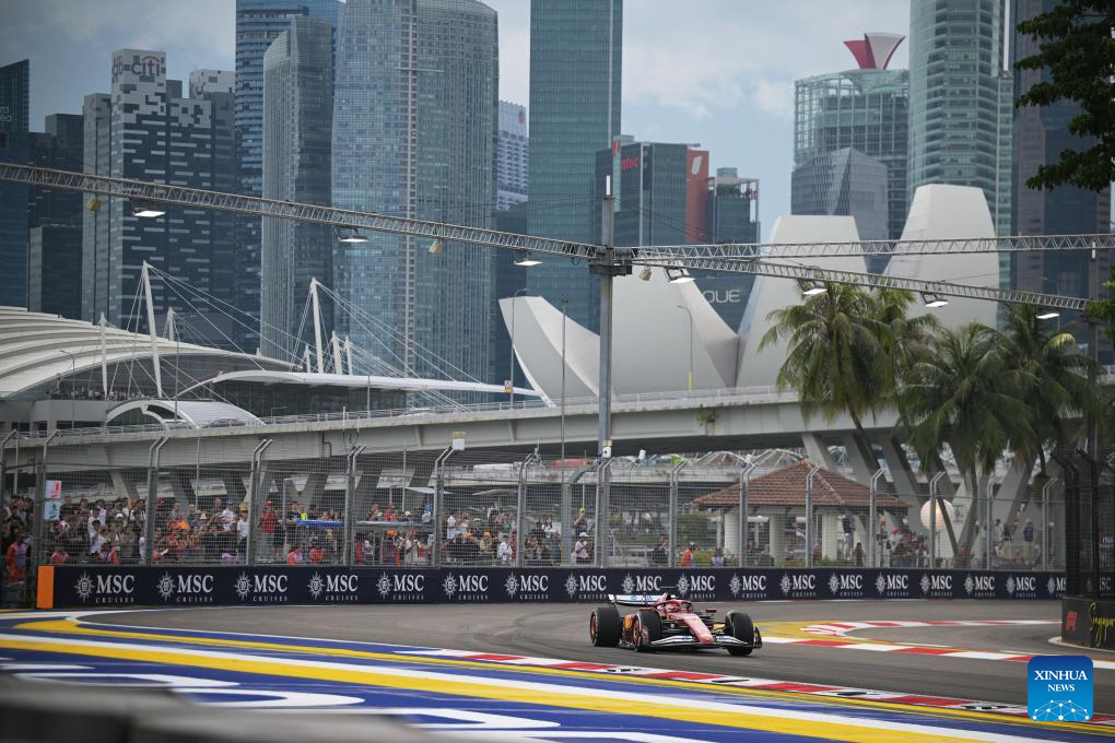 SINGAPUR, 3 octubre, 2025 (Xinhua) -- El piloto monegasco de la escudería Ferrari, Charles Leclerc, compite durante la primera sesión de práctica del Gran Premio de Singapur 2025 de Fórmula 1, en Singapur, el 3 de octubre de 2025. (Xinhua/Then Chih Wey)