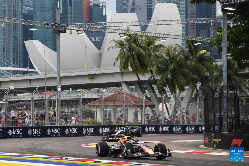 SINGAPUR, 3 octubre, 2025 (Xinhua) -- El piloto neerlandés de la escudería Red Bull, Max Verstappen (frente), compite durante la primera sesión de práctica del Gran Premio de Singapur 2025 de Fórmula 1, en Singapur, el 3 de octubre de 2025. (Xinhua/Then Chih Wey)