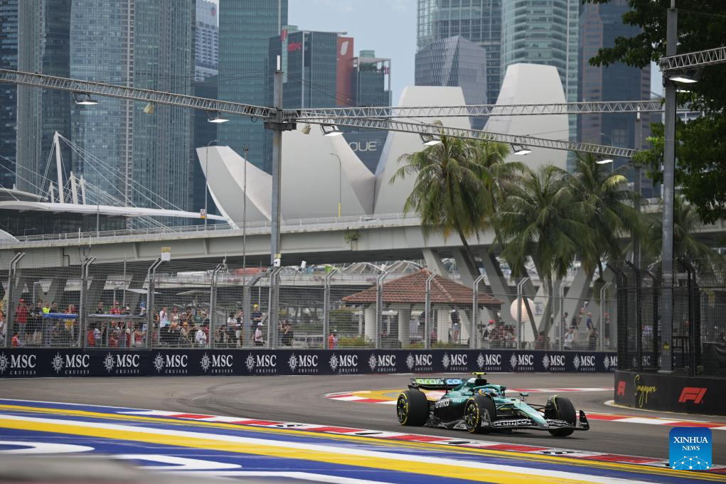 SINGAPUR, 3 octubre, 2025 (Xinhua) -- El piloto español de la escudería Aston Martin, Fernando Alonso, compite durante la primera sesión de práctica del Gran Premio de Singapur 2025 de Fórmula 1, en Singapur, el 3 de octubre de 2025. (Xinhua/Then Chih Wey)
