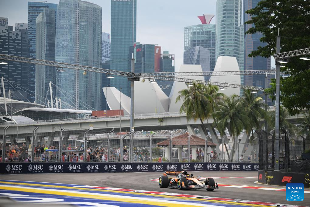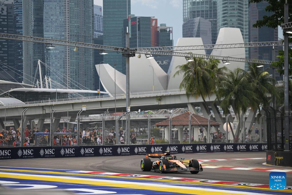 SINGAPUR, 3 octubre, 2025 (Xinhua) -- El piloto británico de la escudería McLaren, Lando Norris, compite durante la primera sesión de práctica del Gran Premio de Singapur 2025 de Fórmula 1, en Singapur, el 3 de octubre de 2025. (Xinhua/Then Chih Wey)