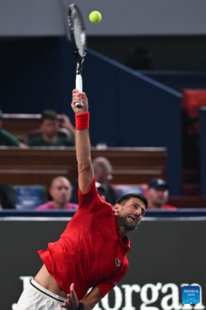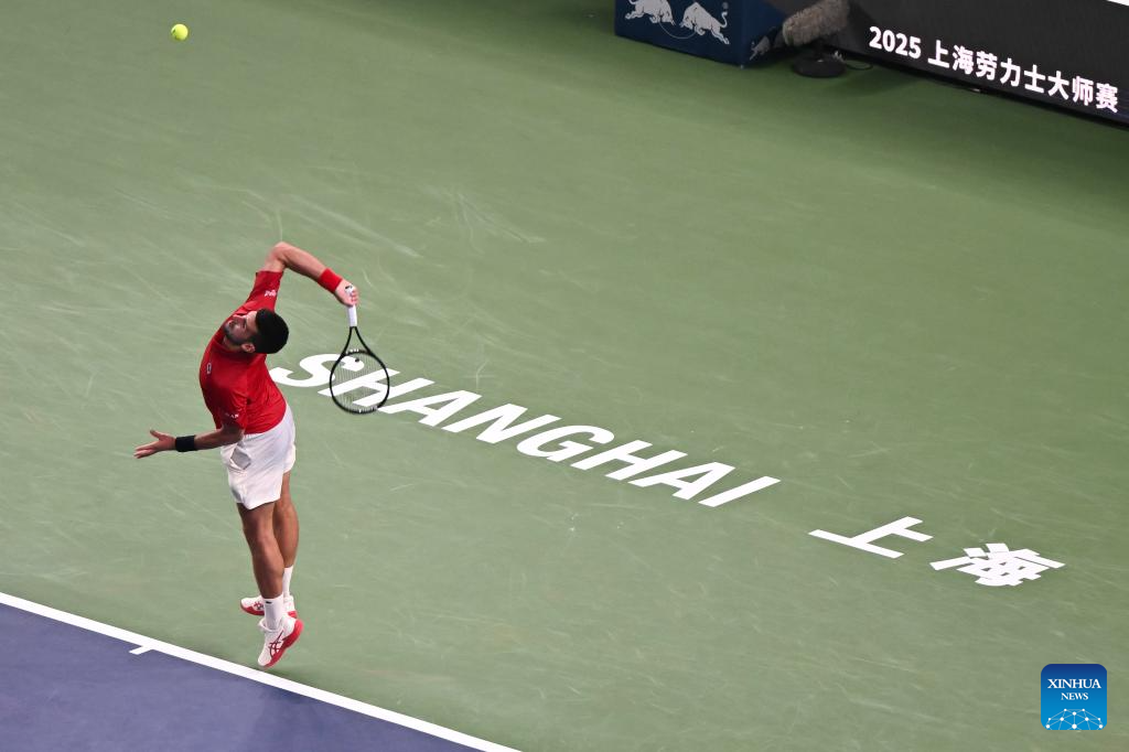SHANGHAI, 3 octubre, 2025 (Xinhua) -- Novak Djokovic sirve la pelota durante el partido de treintaidosavos de final de individuales masculinos entre Novak Djokovic, de Serbia, y Borna Coric, de Croacia, en el torneo de tenis Masters de Shanghai del ATP World Tour, en Shanghai, en el este de China, el 3 de octubre de 2025. (Xinhua/Chen Haoming)