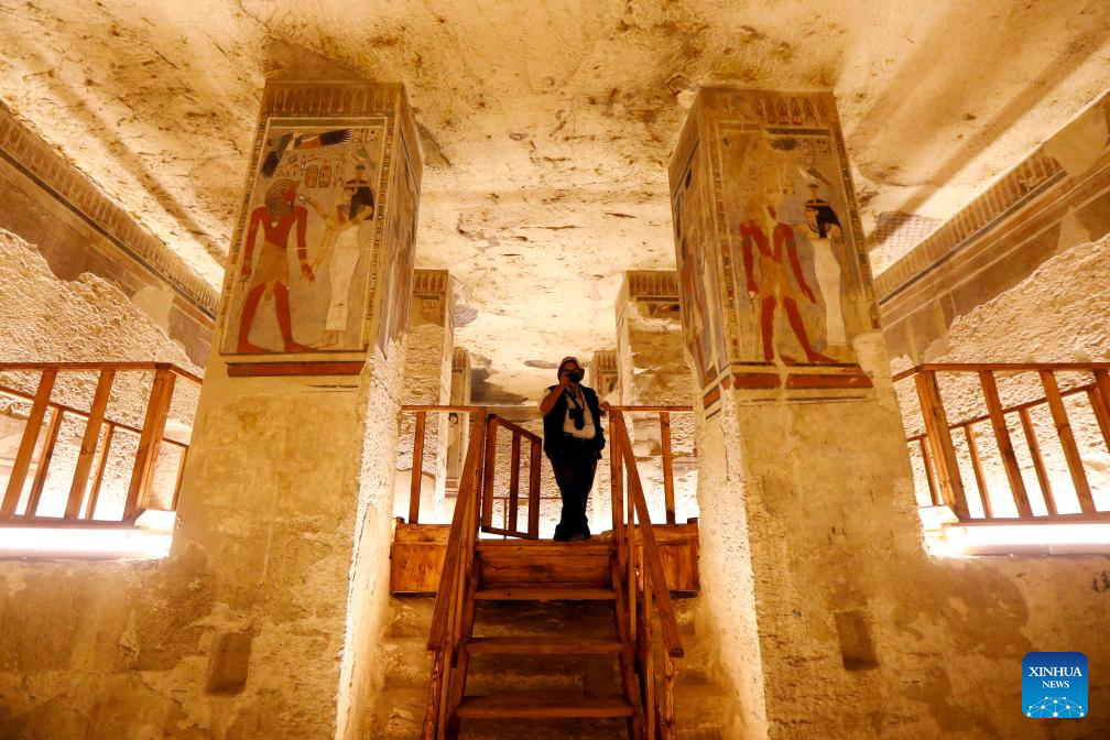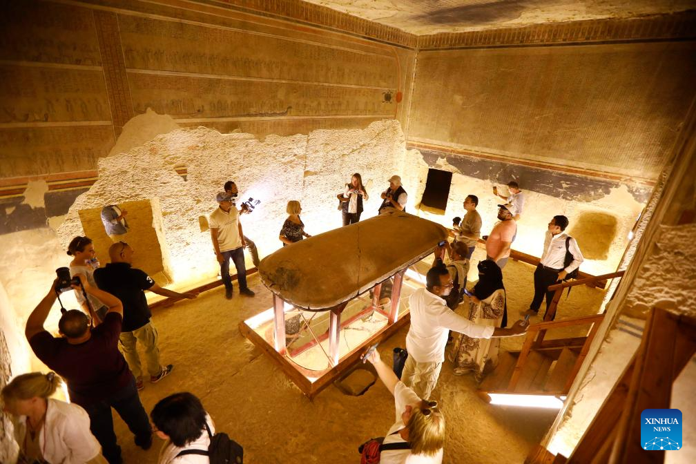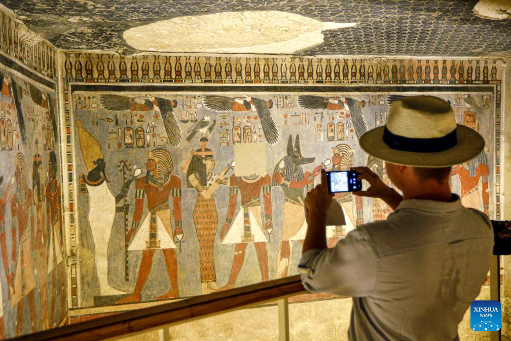 LUXOR, 4 octubre, 2025 (Xinhua) -- Turistas visitan la tumba del faraón Amenhotep III del Imperio Nuevo, en el Valle de los Reyes, en la ribera occidental de Luxor, Egipto, el 4 de octubre de 2025. El Ministerio de Turismo y Antigüedades de Egipto abrió el sábado al público la tumba del faraón Amenhotep III del Imperio Nuevo en el Valle de los Reyes, después de más de dos décadas de restauración. (Xinhua/Ahmed Gomaa)