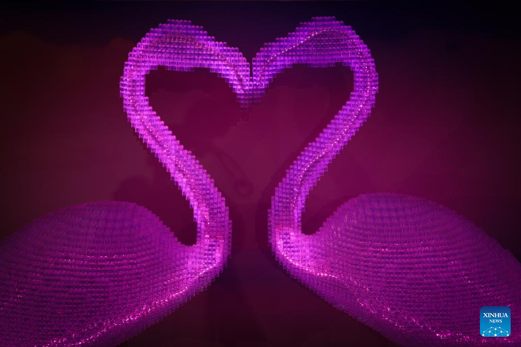 VARSOVIA, 4 octubre, 2025 (Xinhua) -- Imagen del 3 de octubre de 2025 de modelos de flamingos construidos con piezas de Lego exhibidos en una exposición de Lego, en el Estadio Nacional, en Varsovia, Polonia. La exposición de Lego se inauguró aquí el viernes. (Xinhua/Jaap Arriens)