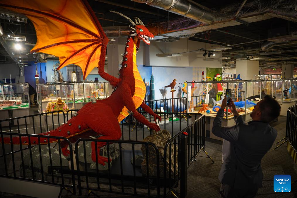 VARSOVIA, 4 octubre, 2025 (Xinhua) -- Imagen del 3 de octubre de 2025 de un visitante tomando fotografías de un modelo de dragón construido con piezas de Lego en una exposición de Lego, en el Estadio Nacional, en Varsovia, Polonia. La exposición de Lego se inauguró aquí el viernes. (Xinhua/Jaap Arriens)