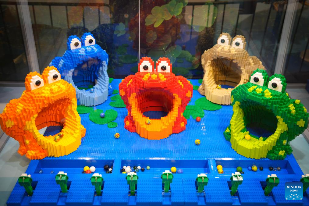 VARSOVIA, 4 octubre, 2025 (Xinhua) -- Imagen del 3 de octubre de 2025 de modelos de ranas construidos con piezas de Lego exhibidos en una exposición de Lego, en el Estadio Nacional, en Varsovia, Polonia. La exposición de Lego se inauguró aquí el viernes. (Xinhua/Jaap Arriens)