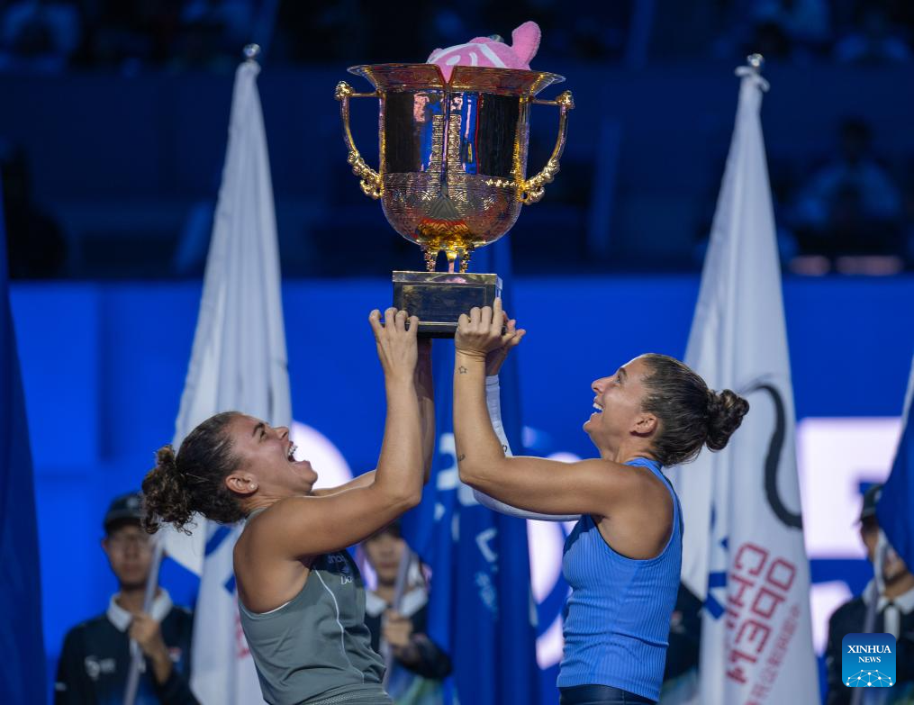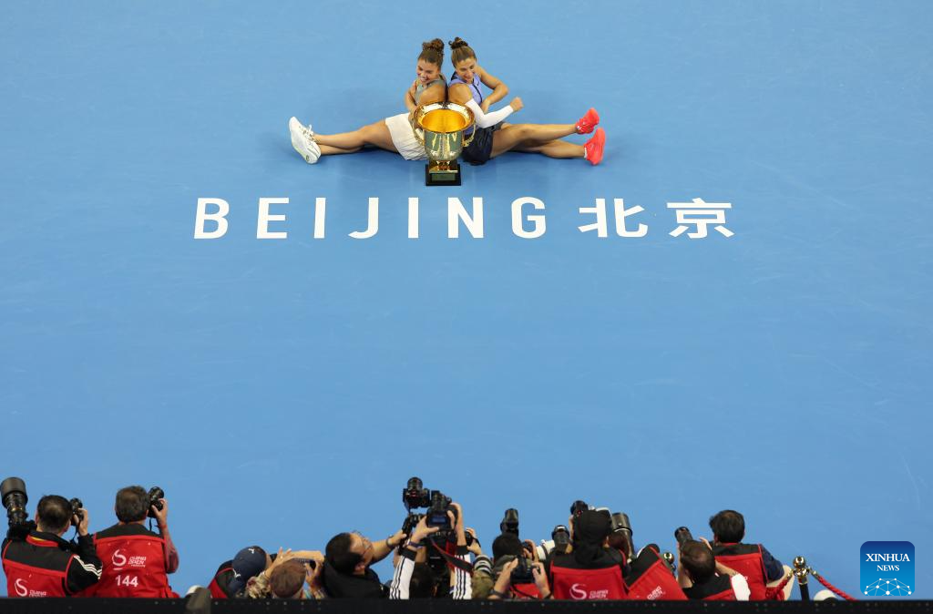 BEIJING, 5 octubre, 2025 (Xinhua) -- Sara Errani/Jasmine Paolini (i) posan para fotografías durante la ceremonia de premiación al término del partido final de dobles femeninos entre Kato Miyu (Japón)/Fanny Stollar (Hungría) y Sara Errani/Jasmine Paolini de Italia, en el torneo de tenis China Open 2025, en Beijing, China, el 5 de octubre de 2025. (Xinhua/Bai Xuefei)