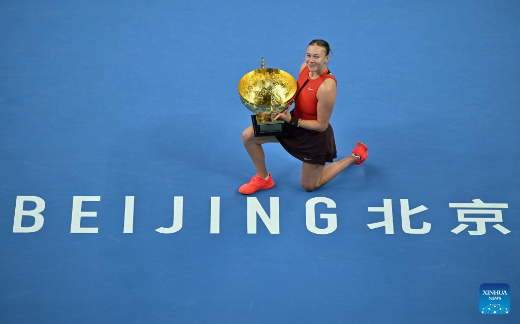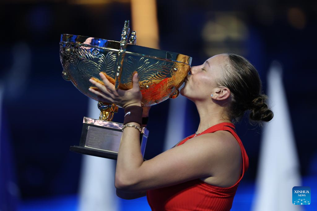BEIJING, 5 octubre, 2025 (Xinhua) -- Amanda Anisimova besa el trofeo durante la ceremonia de premiación al término del partido final de individuales femeninos entre Amanda Anisimova, de Estados Unidos, y Linda Noskova, de República Checa, en el torneo de tenis China Open 2025, en Beijing, China, el 5 de octubre de 2025. (Xinhua/Bai Xuefei)