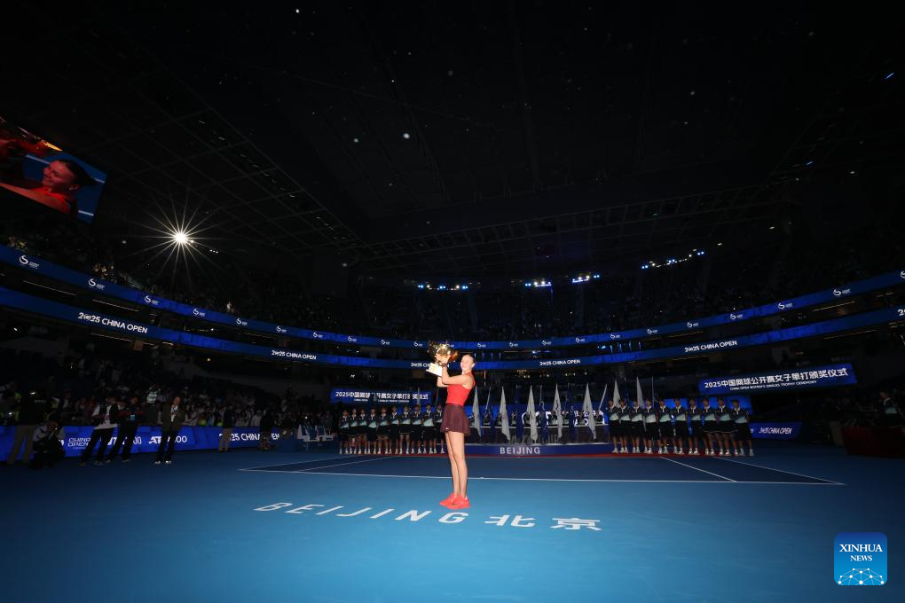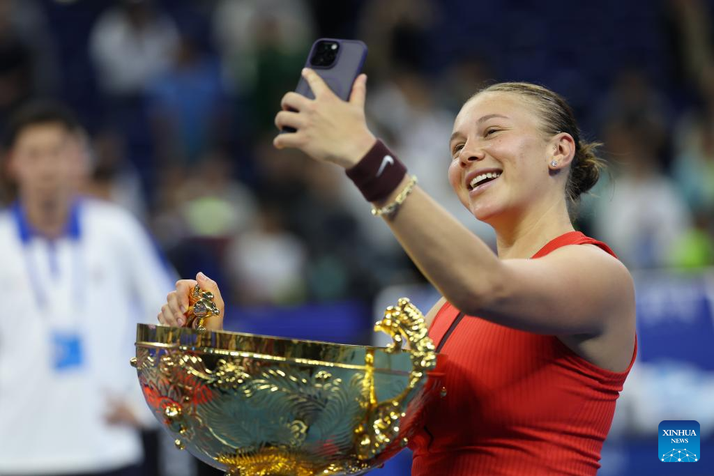 BEIJING, 5 octubre, 2025 (Xinhua) -- Amanda Anisimova se toma una fotografía durante la ceremonia de premiación al término del partido final de individuales femeninos entre Amanda Anisimova, de Estados Unidos, y Linda Noskova, de República Checa, en el torneo de tenis China Open 2025, en Beijing, China, el 5 de octubre de 2025. (Xinhua/Bai Xuefei)