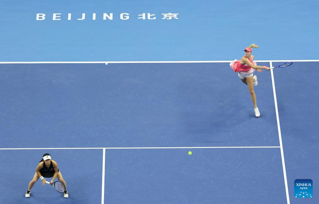 BEIJING, 5 octubre, 2025 (Xinhua) -- Kato Miyu/Fanny Stollar (arriba) compiten durante la ceremonia de premiación al término del partido final de dobles femeninos entre Kato Miyu (Japón)/Fanny Stollar (Hungría) y Sara Errani/Jasmine Paolini de Italia, en el torneo de tenis China Open 2025, en Beijing, China, el 5 de octubre de 2025. (Xinhua/Bai Xuefei)