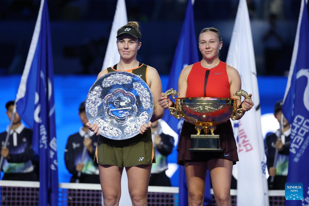 BEIJING, 5 octubre, 2025 (Xinhua) -- La ganadora del primer lugar, Amanda Anisimova (d) y la ganadora del segundo lugar, Linda Noskova, posan para fotografías durante la ceremonia de premiación al término del partido final de individuales femeninos entre Amanda Anisimova, de Estados Unidos, y Linda Noskova, de República Checa, en el torneo de tenis China Open 2025, en Beijing, China, el 5 de octubre de 2025. (Xinhua/Bai Xuefei)