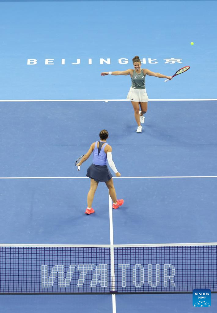 BEIJING, 5 octubre, 2025 (Xinhua) -- Sara Errani/Jasmine Paolini (arriba) reaccionan durante el partido final de dobles femeninos entre Kato Miyu (Japón)/Fanny Stollar (Hungría) y Sara Errani/Jasmine Paolini de Italia, en el torneo de tenis China Open 2025, en Beijing, China, el 5 de octubre de 2025. (Xinhua/Bai Xuefei)