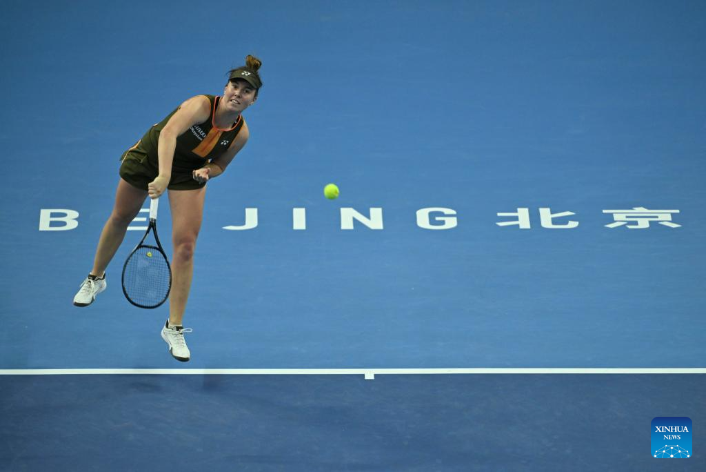BEIJING, 5 octubre, 2025 (Xinhua) -- Linda Noskova sirve la pelota durante el partido final de individuales femeninos entre Amanda Anisimova, de Estados Unidos, y Linda Noskova, de República Checa, en el torneo de tenis China Open 2025, en Beijing, China, el 5 de octubre de 2025. (Xinhua/Hu Jingwen)