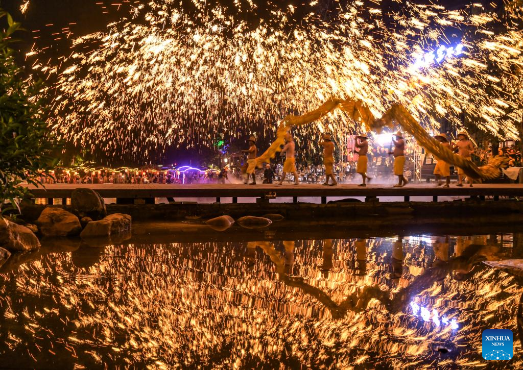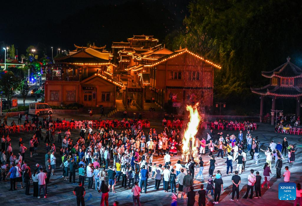 BEIJING, 6 octubre, 2025 (Xinhua) -- Imagen del 5 de octubre de 2025 de turistas y residentes bailando alrededor de una fogata en un punto escénico, en el distrito de Qinglong, en la provincia de Guizhou, en el suroeste de China. A medida que convergen las vacaciones por el Día Nacional de China y el Festival del Medio Otoño, las actividades culturales, las activas redes de transporte y las innovadoras escenas de consumo del país están pintando un panorama vívido de resiliencia económica y potencial de crecimiento. (Xinhua/Yang Wenbin)