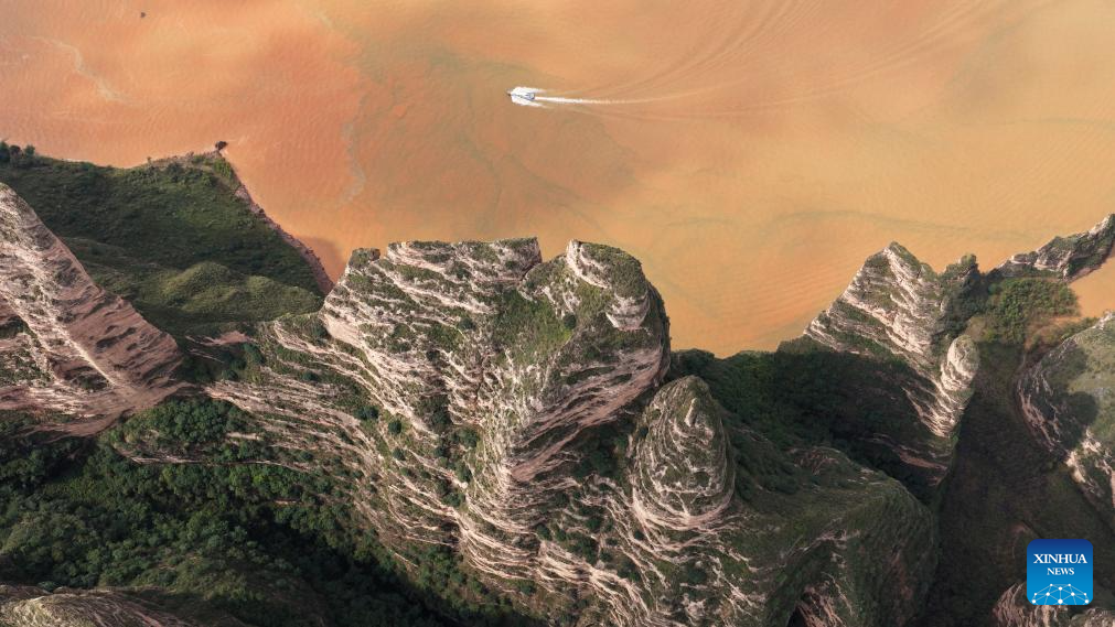 BEIJING, 6 octubre, 2025 (Xinhua) -- Vista aérea tomada con un dron el 6 de octubre de 2025 de turistas a bordo de un bote en el Parque Nacional Geológico Bingling Danxia, en el distrito de Yongjing, en la provincia de Gansu, en el noroeste de China. A medida que convergen las vacaciones por el Día Nacional de China y el Festival del Medio Otoño, las actividades culturales, las activas redes de transporte y las innovadoras escenas de consumo del país están pintando un panorama vívido de resiliencia económica y potencial de crecimiento. (Xinhua/Shi Youdong)