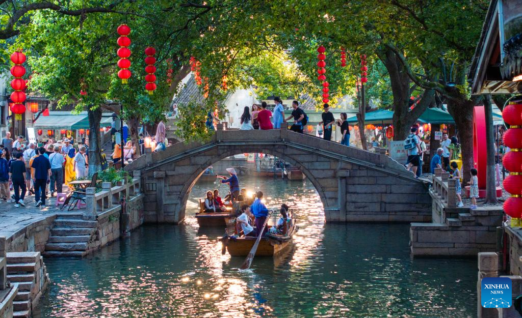 BEIJING, 6 octubre, 2025 (Xinhua) -- Imagen tomada con un dron el 6 de octubre de 2025 de turistas a bordo de un bote en un área escénica, en Suzhou, en la provincia de Jiangsu, en el este de China. A medida que convergen las vacaciones por el Día Nacional de China y el Festival del Medio Otoño, las actividades culturales, las activas redes de transporte y las innovadoras escenas de consumo del país están pintando un panorama vívido de resiliencia económica y potencial de crecimiento. (Xinhua/Zhou Shegen)