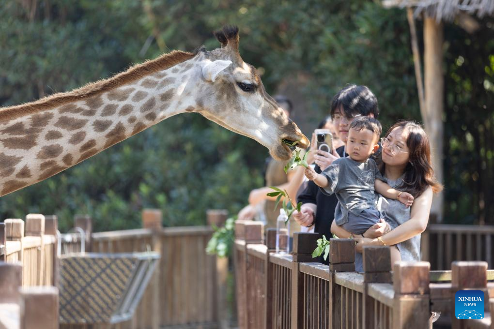 BEIJING, 6 octubre, 2025 (Xinhua) -- Un niño interactúa con una jirafa en un zoológico, en Shanghai, en el este de China, el 6 de octubre de 2025. A medida que convergen las vacaciones por el Día Nacional de China y el Festival del Medio Otoño, las actividades culturales, las activas redes de transporte y las innovadoras escenas de consumo del país están pintando un panorama vívido de resiliencia económica y potencial de crecimiento. (Xinhua/Wang Xiang)