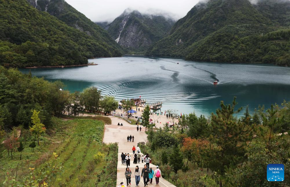 BEIJING, 6 octubre, 2025 (Xinhua) -- Turistas visitan el punto escénico del lago Tianchi, en el distrito de Wenxian, en la provincia de Gansu, en el noroeste de China, el 6 de octubre de 2025. A medida que convergen las vacaciones por el Día Nacional de China y el Festival del Medio Otoño, las actividades culturales, las activas redes de transporte y las innovadoras escenas de consumo del país están pintando un panorama vívido de resiliencia económica y potencial de crecimiento. (Xinhua/Wang Kexian)