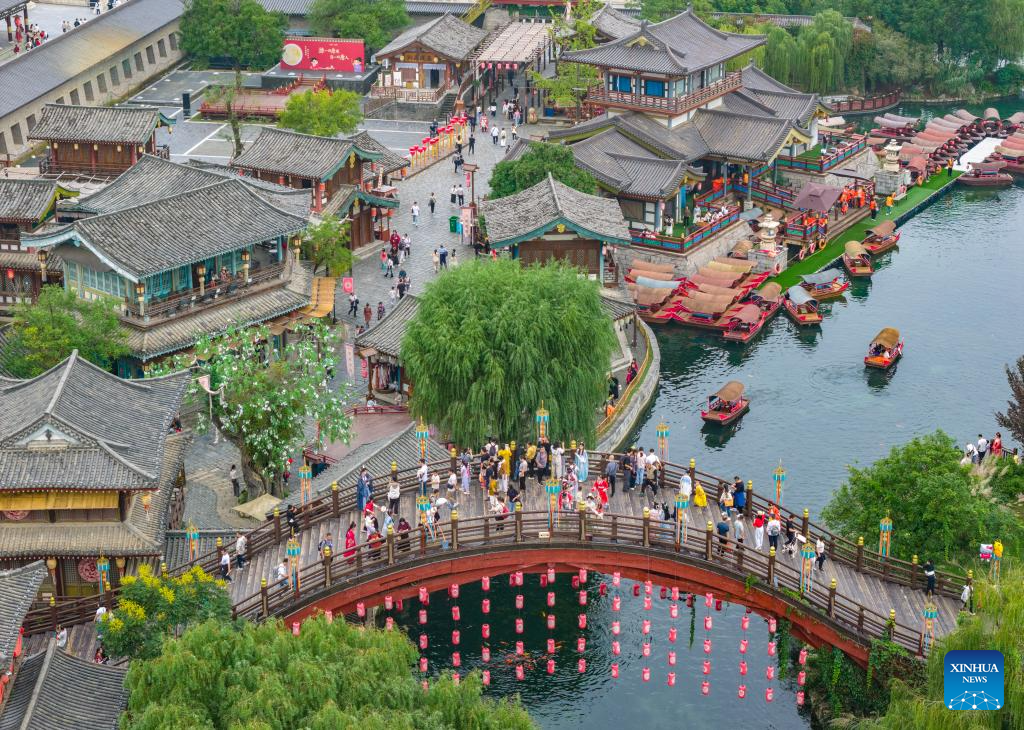 BEIJING, 6 octubre, 2025 (Xinhua) -- Imagen del 5 de octubre de 2025 de artistas folclóricos realizando una presentación en un punto escénico, en Chengdu, en la provincia de Sichuan, en el suroeste de China. A medida que convergen las vacaciones por el Día Nacional de China y el Festival del Medio Otoño, las actividades culturales, las activas redes de transporte y las innovadoras escenas de consumo del país están pintando un panorama vívido de resiliencia económica y potencial de crecimiento. (Xinhua/Li Xiangyu)
