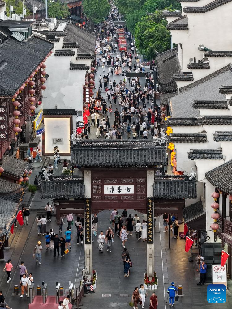 BEIJING, 7 octubre, 2025 (Xinhua) -- Imagen tomada con un dron el 7 de octubre de 2025 de turistas visitando el área escénica del Templo Fuzi (Confucio), en Nanjing, en la provincia de Jiangsu, en el este de China. Turistas de todo el país no muestran signos de que su entusiasmo vaya a disminuir a medida que se acercan al final las vacaciones del Día Nacional y el Festival del Medio Otoño. (Xinhua/Li Bo)