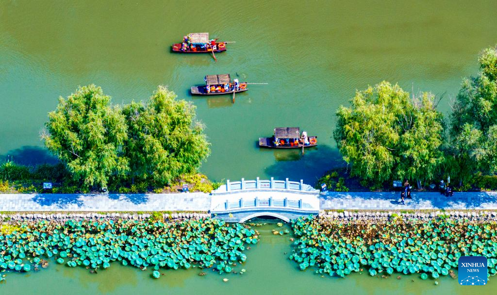 BEIJING, 7 octubre, 2025 (Xinhua) -- Imagen tomada con un dron el 7 de octubre de 2025 de turistas navegando en botes en el Parque Nacional del Humedal de Lixiahe, en la ciudad de Xinghua, en la provincia de Jiangsu, en el este de China. Turistas de todo el país no muestran señales de que su entusiasmo disminuya a medida que las vacaciones por el Día Nacional y el Festival del Medio Otoño llegan a su fin. (Xinhua/Zhou Shegen)