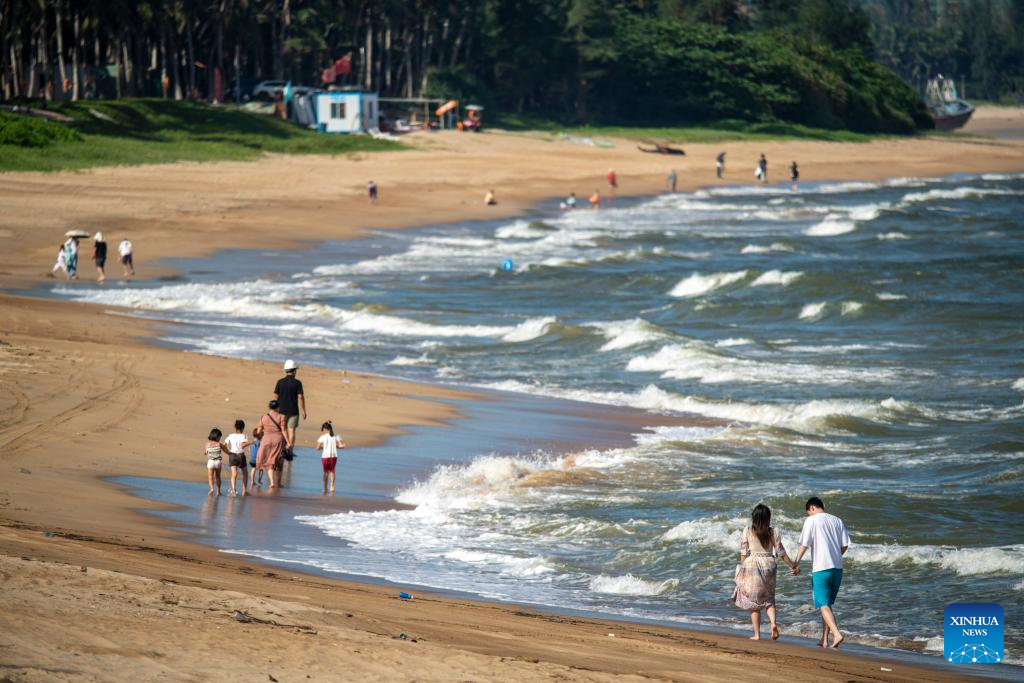 Imagen del 8 de octubre de 2025 de turistas divirtiéndose a lo largo de la playa, en Boao, en la ciudad de Qionghai de la provincia de Hainan, en el sur de China. China registró 888 millones de viajes turísticos dentro del territorio nacional durante los ocho días de vacaciones con motivo del Día Nacional y el Festival del Medio Otoño, lo que constituye un aumento de 123 millones frente a las vacaciones de siete días del Día Nacional en 2024, informó hoy jueves el Ministerio de Cultura y Turismo. (Xinhua/Meng Zhongde)
