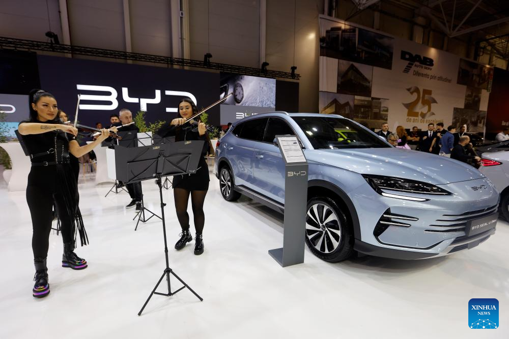 BUCAREST, 8 octubre, 2025 (Xinhua) -- Imagen del 7 de octubre de 2025 de artistas realizando una presentación en el estand de BYD de China durante el 22.º Salón del Automóvil y Accesorios de Bucarest, en Bucarest, Rumania. El evento comenzó aquí el martes y se permanecerá hasta el 12 de octubre, participando alrededor de 30 empresas internacionales exhibiendo vehículos convencionales, híbridos y eléctricos. (Xinhua/Cristian Cristel)