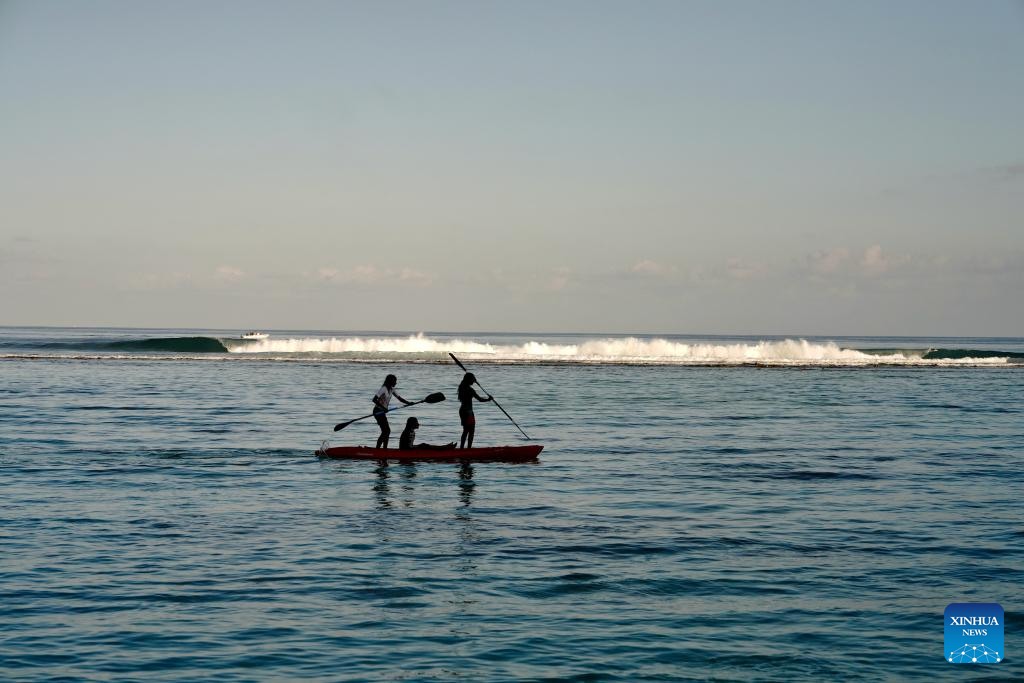 MALE, 9 octubre, 2025 (Xinhua) -- Imagen del 3 de octubre de 2025 de personas remando en un bote en el mar, en Hulhumale, Maldivas. (Xinhua/Wu Yue)