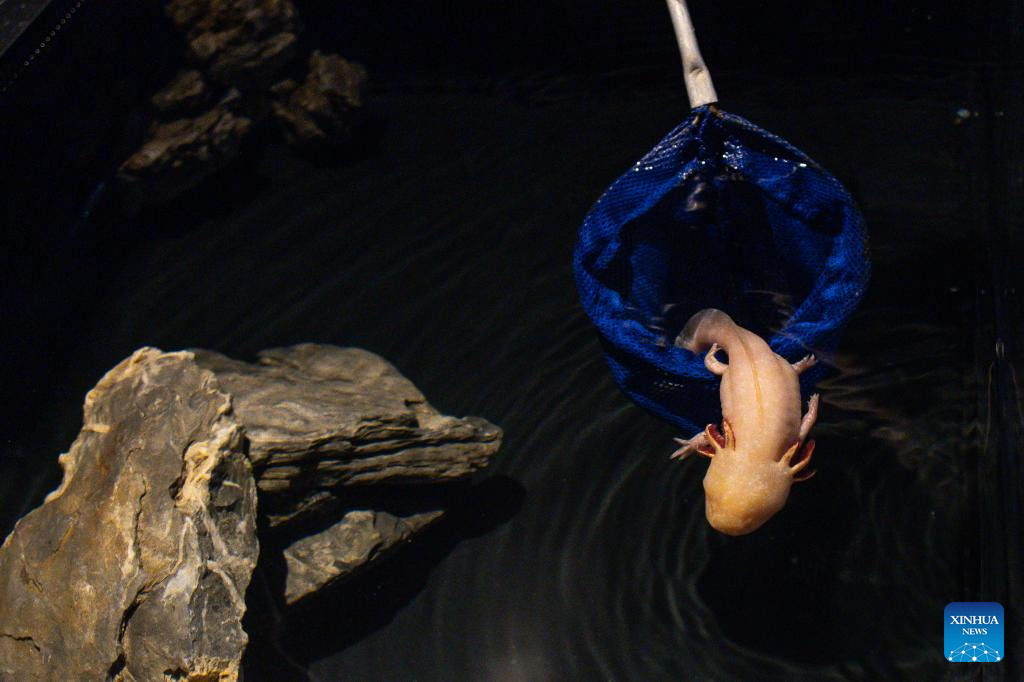RIO DE JANEIRO, 9 octubre, 2025 (Xinhua) -- Imagen del 8 de octubre de 2025 de un un ajolote siendo alimentado con comida especial en su nuevo tanque en el BioParque do Rio, en Río de Janeiro, Brasil. En los últimos días, se abrió al público la recién inaugurada área de exhibición de ajolotes en el BioParque do Rio, con 22 ejemplares, incluyendo 8 rescatados durante operativos contra el tráfico de fauna silvestre. (Xinhua/Claudia Martini)