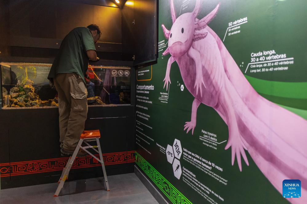 RIO DE JANEIRO, 9 octubre, 2025 (Xinhua) -- Imagen del 8 de octubre de 2025 de un técnico inspeccionando el nuevo tanque de ajolotes en el BioParque do Rio, en Río de Janeiro, Brasil. En los últimos días, se abrió al público la recién inaugurada área de exhibición de ajolotes en el BioParque do Rio, con 22 ejemplares, incluyendo 8 rescatados durante operativos contra el tráfico de fauna silvestre. (Xinhua/Claudia Martini)