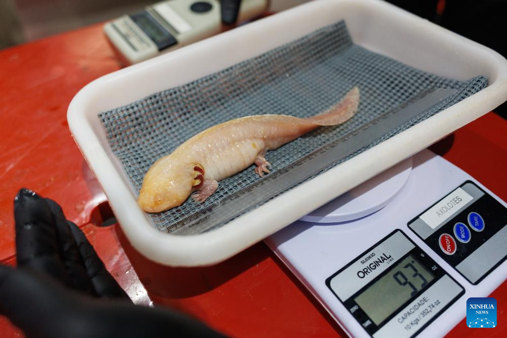 RIO DE JANEIRO, 9 octubre, 2025 (Xinhua) -- Imagen del 8 de octubre de 2025 de un un ajolote siendo pesado y medido en el BioParque do Rio, en Río de Janeiro, Brasil. En los últimos días, se abrió al público la recién inaugurada área de exhibición de ajolotes en el BioParque do Rio, con 22 ejemplares, incluyendo 8 rescatados durante operativos contra el tráfico de fauna silvestre. (Xinhua/Claudia Martini)