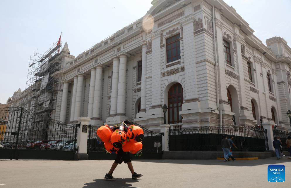 Un vendedor de piñatas camina frente al Edificio del Congreso durante el primer día de Gobierno del presidente peruano, José Jerí, en Lima, Perú, el 10 de octubre de 2025. Jerí asumió la madrugada del viernes la Presidencia de la nación sudamericana, luego de que el Congreso decidiera con 122 votos destituir del cargo a Dina Boluarte. (Xinhua/Mariana Bazo)